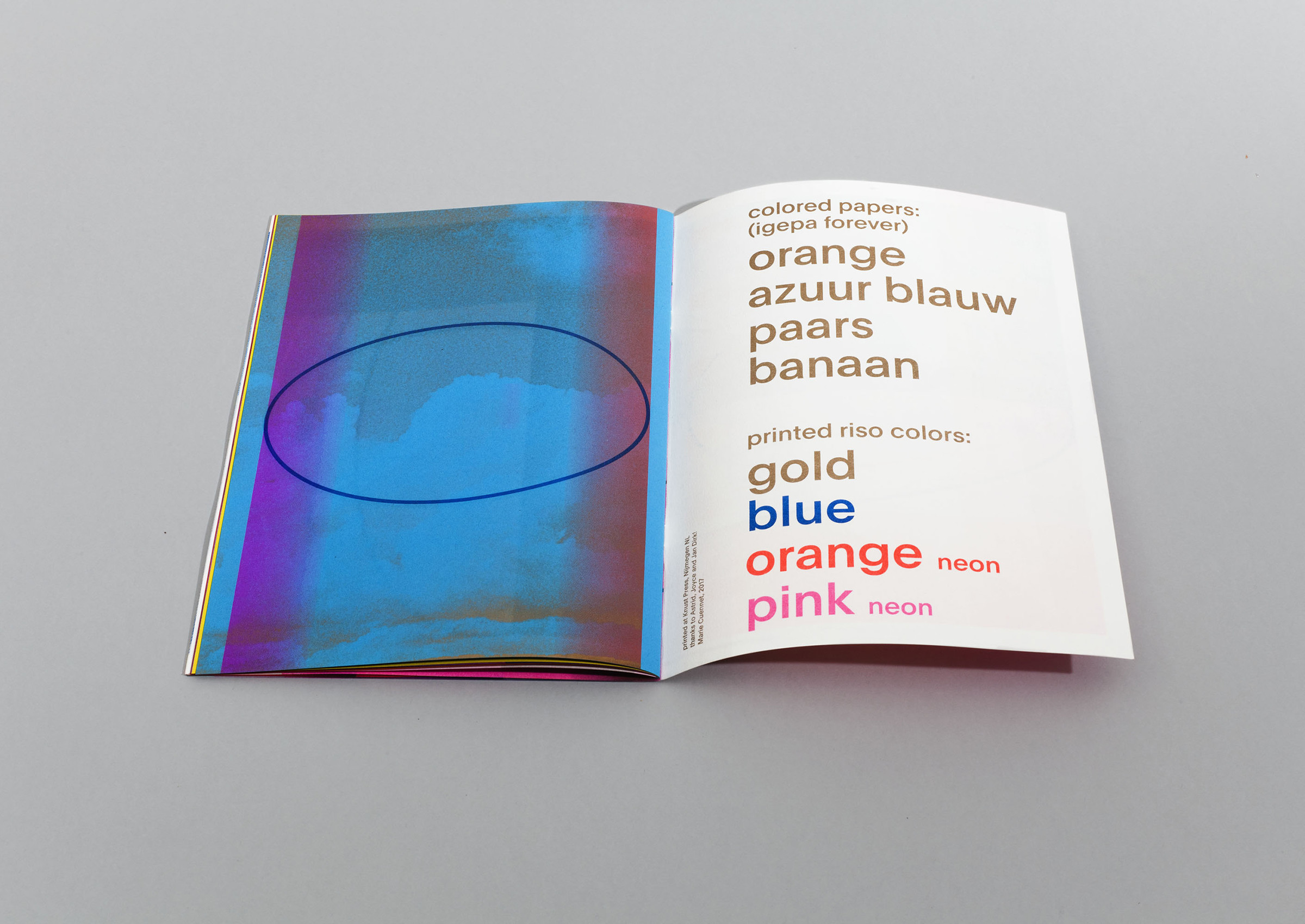 4 Colors 5 Papers i 190×253 mm Risograph printing Knust Press, Extrapool, NL 2017 Print experiment exploring effects of printed risograph colors on colored papers.This booklet was made during a short residency at Extrapool, Nijmegen, NL. See also te re-edition here. Prev Next