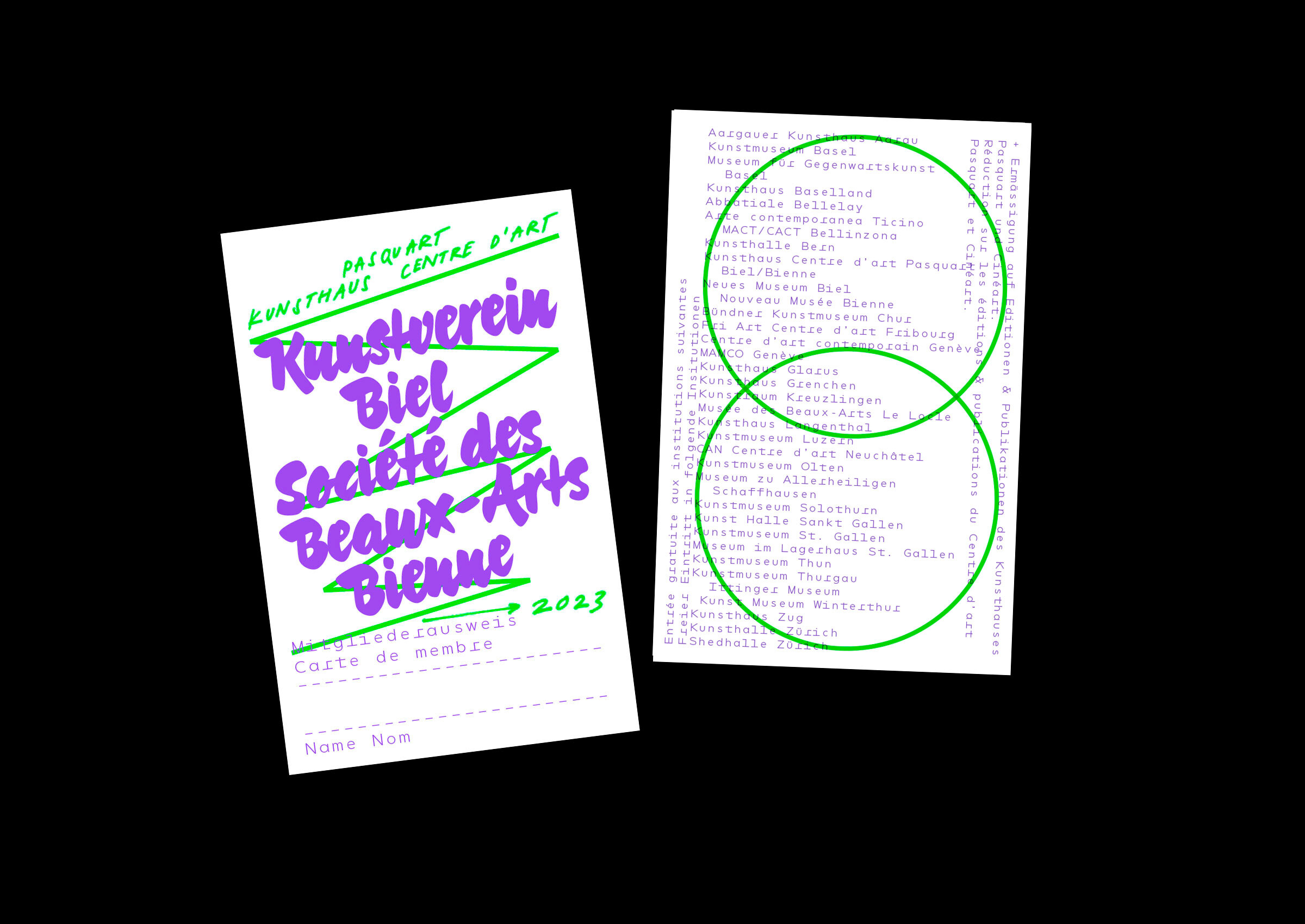 Annual programm 2023 for the Kunsthaus Biel / Centre d’art Bienne and Membercard of the Kunstverein Biel/Bienne.